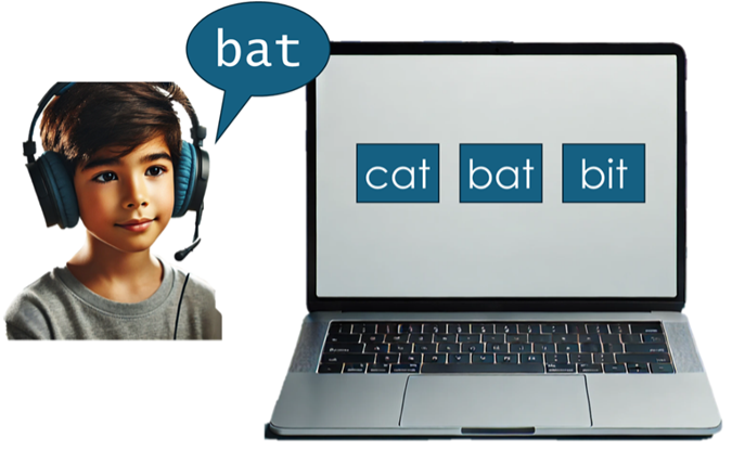 Many app-based word recognition programs exist, but little is known about their effectiveness or best use. These apps gradually introduce literacy concepts based on current reading performance, starting with letter sounds, then simple words (e.g., bat), common spelling patterns (e.g., EE), and eventually polysyllabic words (e.g., robot, replacement). Most use receptive exercises where children listen and select the correct word (see Figure 1), while few currently use speech recognition for spoken responses – though more are being developed.